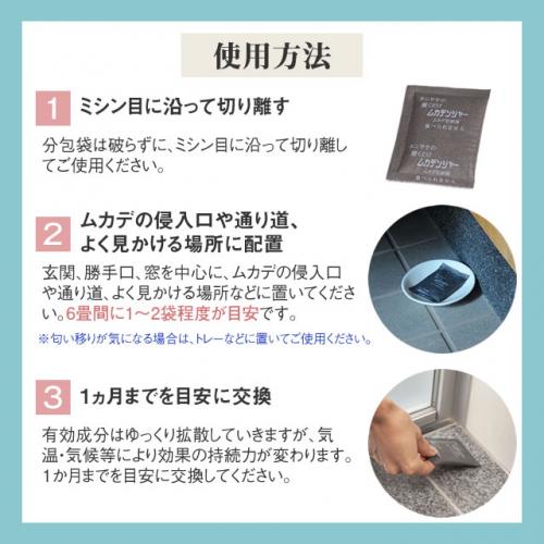 切り離して1袋づつ、玄関・部屋の入口など、ムカデが入ってきそうな場所に置くだけで寄せ付けません。