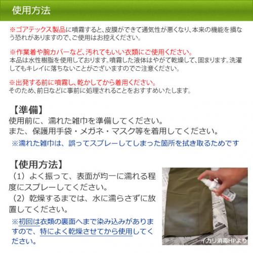 ※また、ゴアテックス製品に本品を噴霧すると、皮膜が出来て通気性が悪くなり、本来の機能を損なう恐れがありますので、ご使用はお控えください。