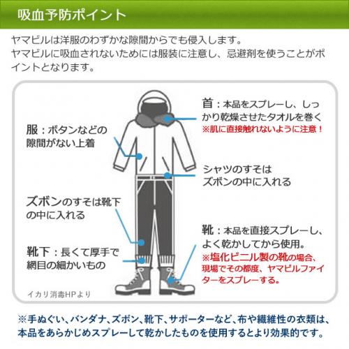 ヤマビルファイターをスプレーしたタオルやハンカチを足首などに巻くことを推奨します。
