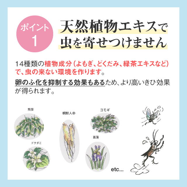 14種類の植物成分(よもぎ、どくだみ、緑茶エキスなど)で、虫の来ない環境を作ります。