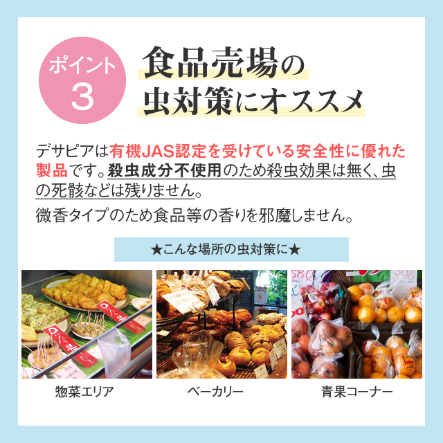 デサピアは有機JAS認定を受けている安全性に優れた製品です。殺虫成分不使用のため殺虫効果は無く、虫の死骸などは残りません。