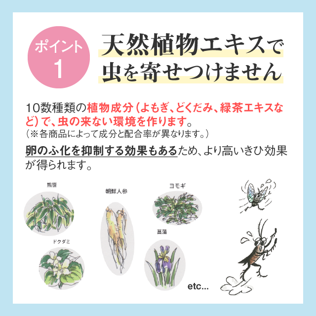 10数種類の植物成分(よもぎ、どくだみ、緑茶エキスなど)で、虫の来ない環境を作ります。