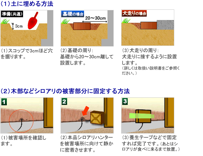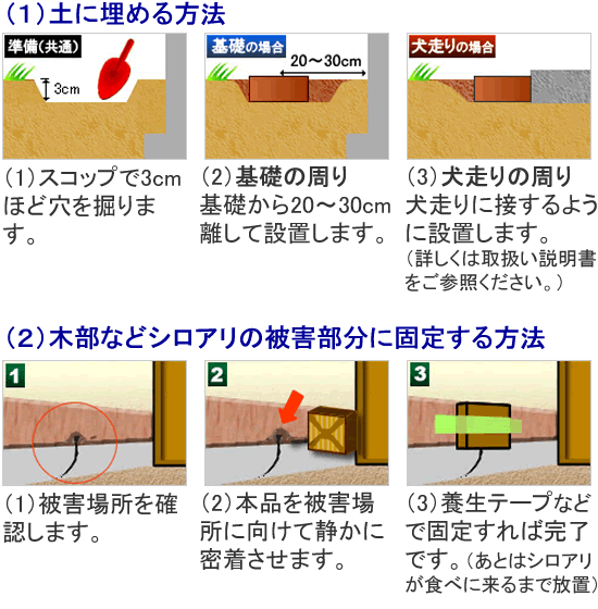 家の周りに埋めたり、被害のあるところ(柱など)に貼るだけ。通常の白アリ駆除のように薬剤を大量に散布しないから環境にもやさしい。