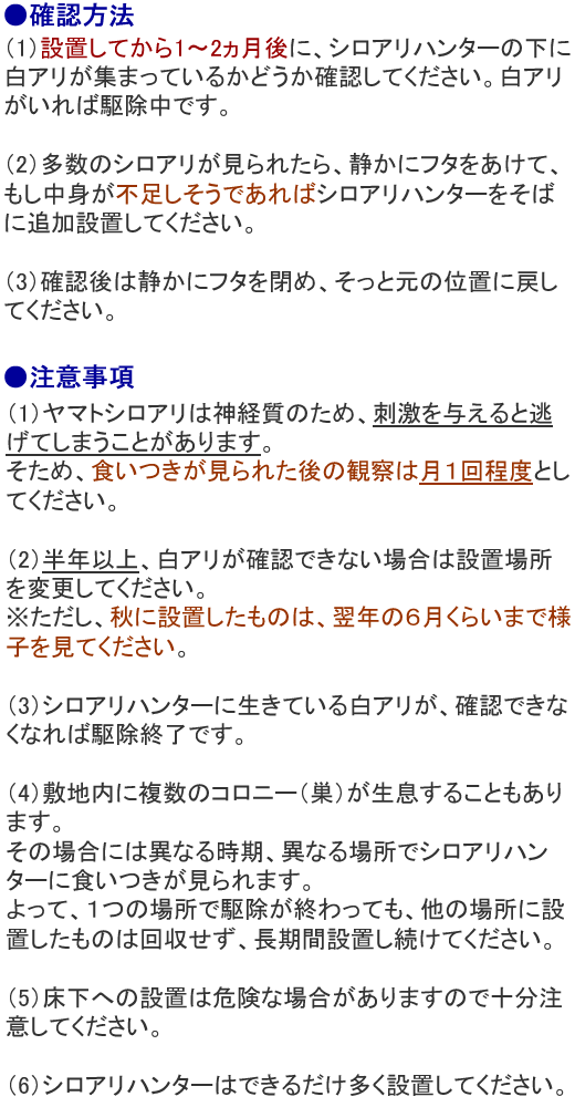 ・本品にシロアリがついているときは絶対に移動しないこと。