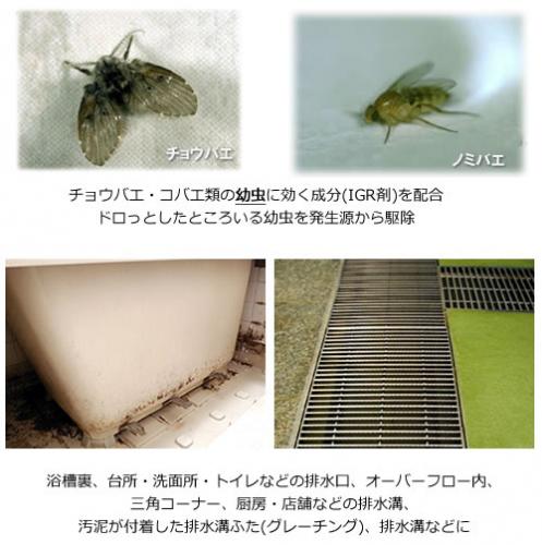 - ・適用害虫:チョウバエ・コバエ成虫・幼虫の駆除