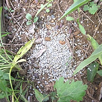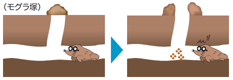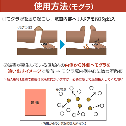 (1)モグラ塚を掘り起こし、坑道内部へ JJボアを約25g投入してください。