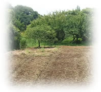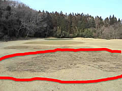 イノシシによる芝の掘り起し被害。被害が広域であったため、一番大きな掘り起しエリアを囲むように散布。