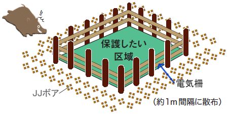 ※JJボアは強いジャスミンのような匂いがします。イノシシの嗅覚と味覚を刺激して忌避します。