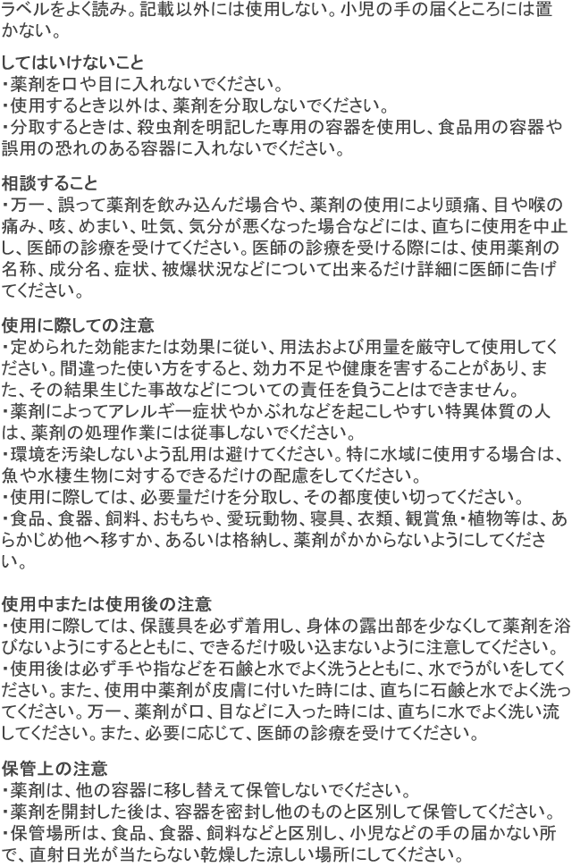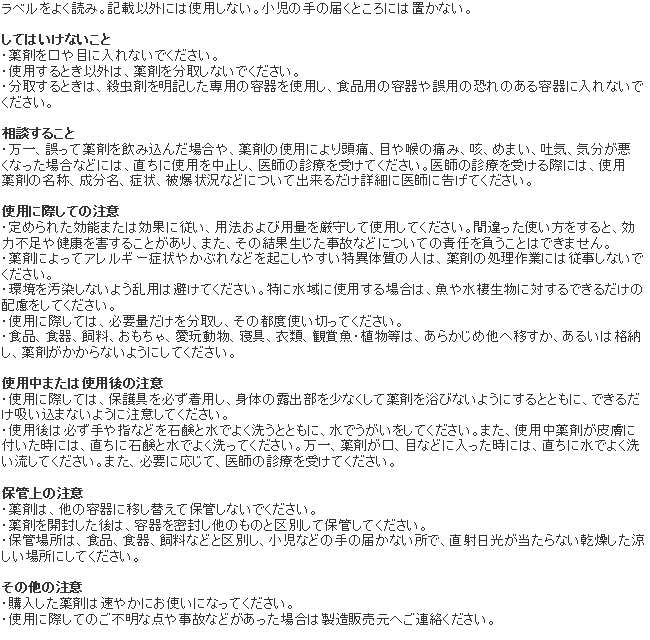 | 蚊幼虫(ボウフラ) | 水量1㎥(立米)につき10g(有効成分0.05ppm)を発生場所にそのまま均一に散布する。 |