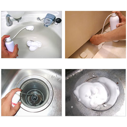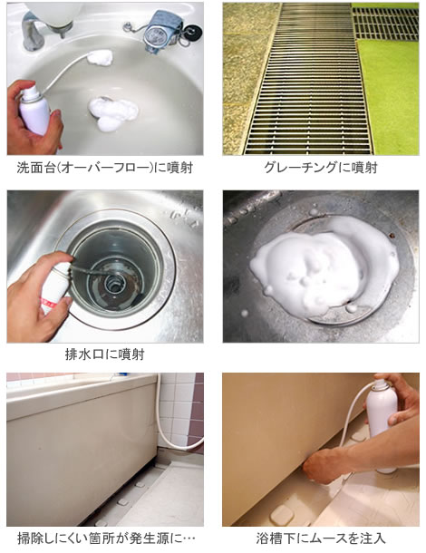 ・配管やオーバーフローなどの空間にムース(泡)を充満させれば、ピレスロイド系殺虫剤によって殺虫駆除します。