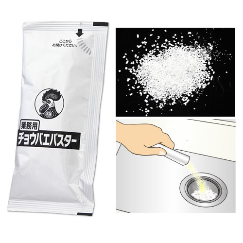 本品は白色の顆粒剤です。チョウバエが発生している水域にそのまま入れるだけです。排水口やグリストラップなどにご利用ください。