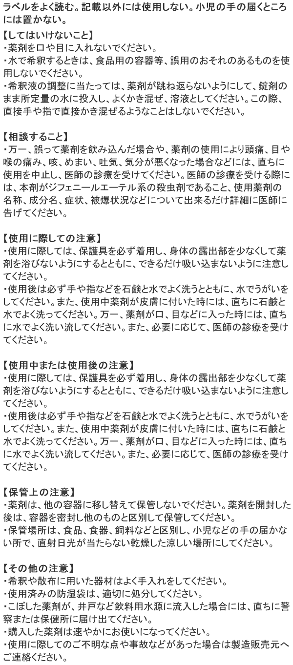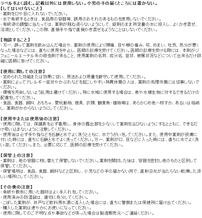 - ・効能 効果:蚊幼虫(ボウフラ)、ハエ幼虫(ウジ)の防除