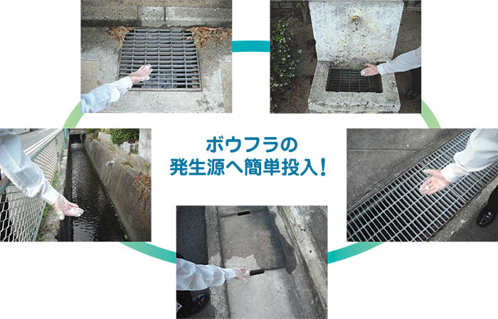 マンホール内や池、河川等広範囲のボウフラ駆除にもそのまま投入するだけです。