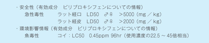 スミラブの成分「ピリプロキシフェン」は、哺乳動物や魚類に対する毒性が極めて低い薬剤です。