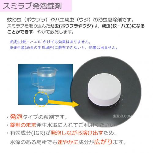 スミラブ発泡錠剤は取扱い簡単な錠剤タイプで、水中に投入すると発泡しながら溶解する昆虫成長制御剤(幼虫駆除剤)です。