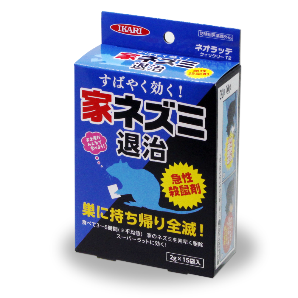 有効成分であるプロマジオロンは、今までにない第二世代のクマリン系殺鼠剤で、ワルファリン抵抗性ネズミ(スーパーラット)にも優れた効果を発揮します。 また、従来のクマリン系殺鼠剤のように畜毒性ではないため、1〜2回の喫食で有効です。