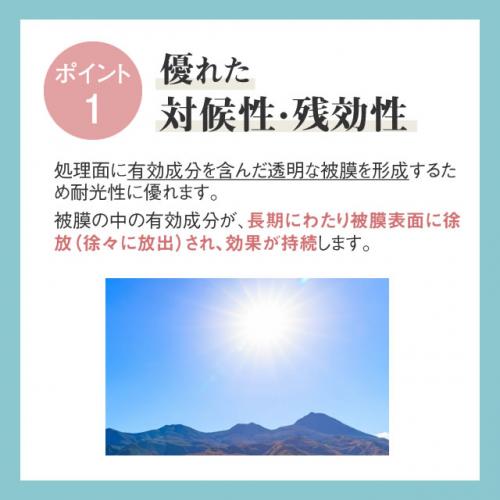 処理面に有効成分を含んだ透明な被膜を形成するため耐光性に優れます。