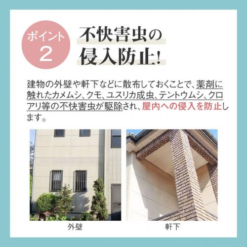 建物の外壁や軒下などに散布しておくことで、薬剤に触れたカメムシ、クモ、ユスリカ成虫、テントウムシ、クロアリ等の不快害虫が駆除され、屋内への侵入を防止します。