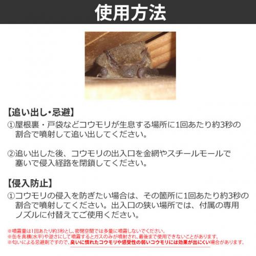 (1)屋根裏・戸袋などコウモリが生息する場所に1回あたり約3秒の割合で噴射して追い出してください。